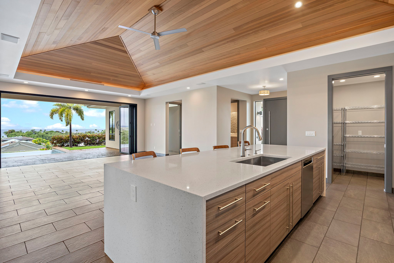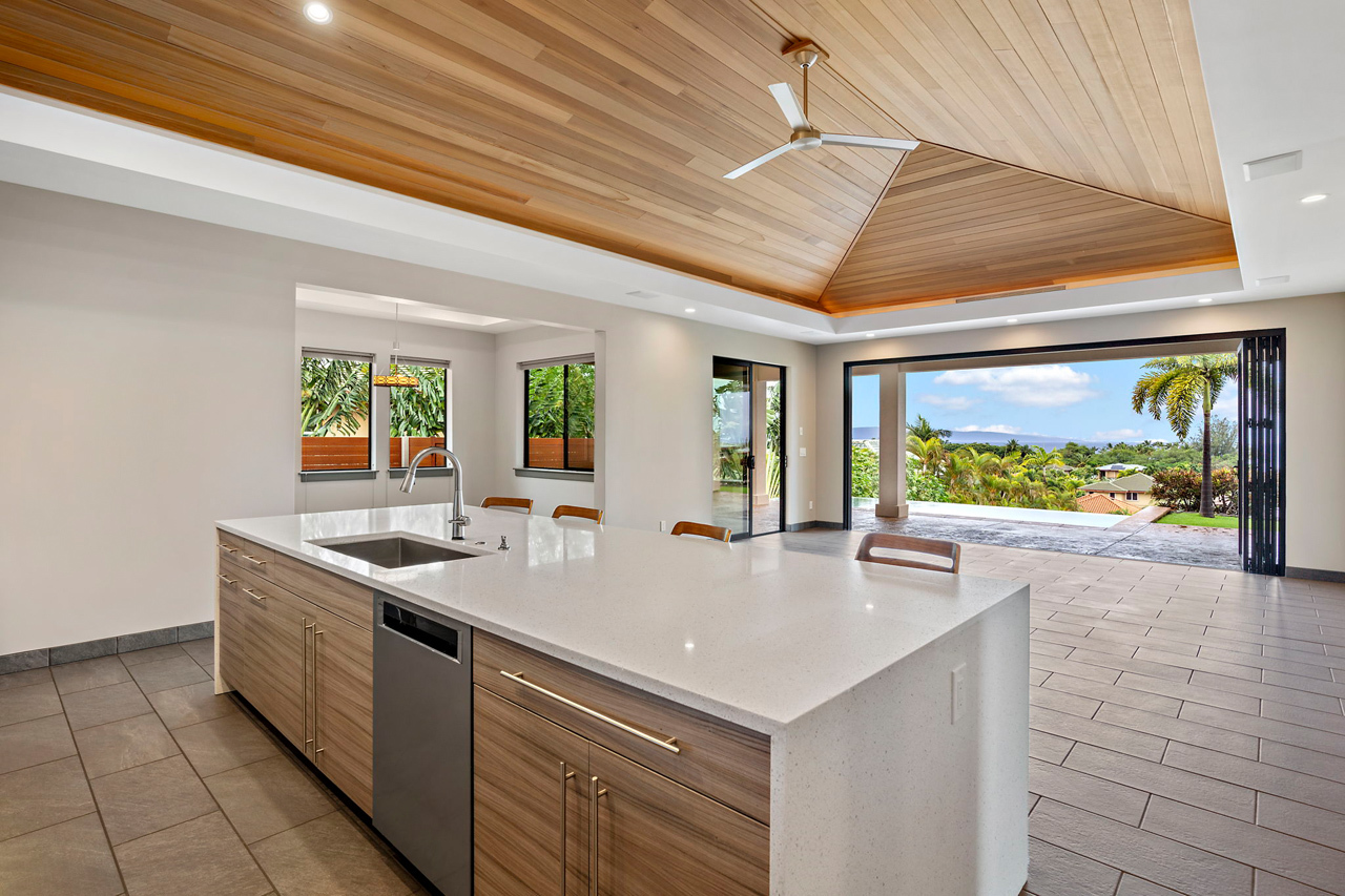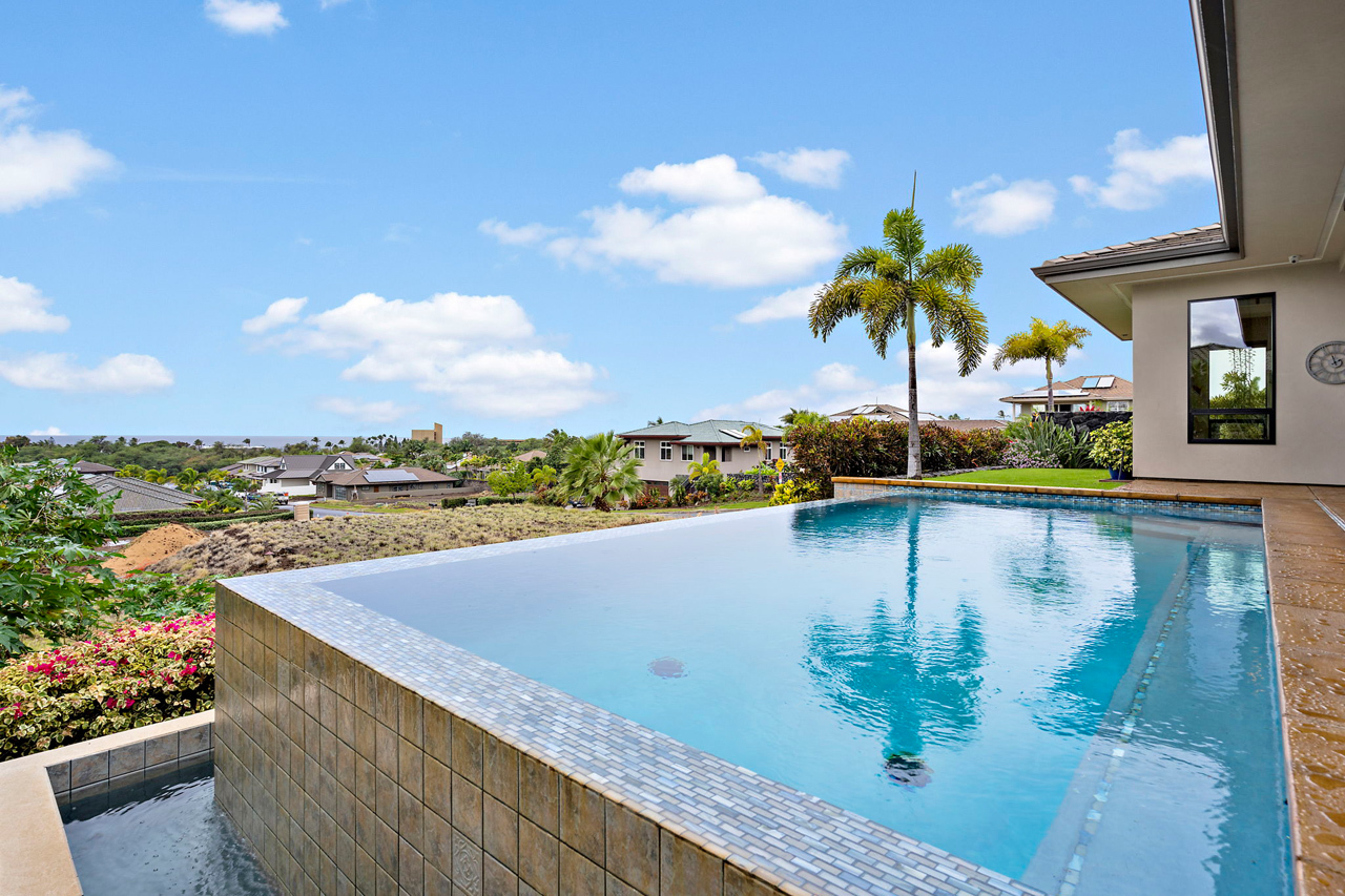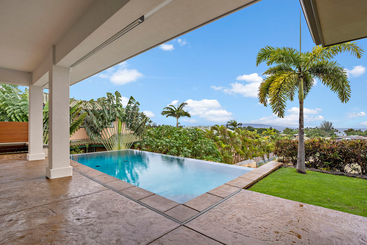 Custom built home offered in the heart of Kilohana Waena. Perched near the very top of the community, this single level retreat offers the perfect contemporary design with gorgeous ocean views from the pool area out towards the Central Pacific. Such a finely appointed residence and extremely versatile single level floor plan. Located walking distance to the world-renowned Keawakapu Beach, and just minutes away from all the Wailea Resort amenities. When you enter through the front door, you will feel a sense of tranquility and immediately notice the builder’s attention to detail. This home features a dream kitchen with spacious center island, sleek quartz counter tops, high-end modern cabinetry, and energy efficient stainless steel appliances. The manicured lawn and tropical landscaping add to the sense of privacy and serenity. This indoor/outdoor living arrangement makes this residence the perfect place for entertaining your friends and family. An absolutely stunning, modern home with a fully finished garage. There is also a photovoltaic system installed which is fully owned to help support your sustainable Maui lifestyle. Central Air conditioning and super efficient LED warm color lighting to add to the custom ambiance.