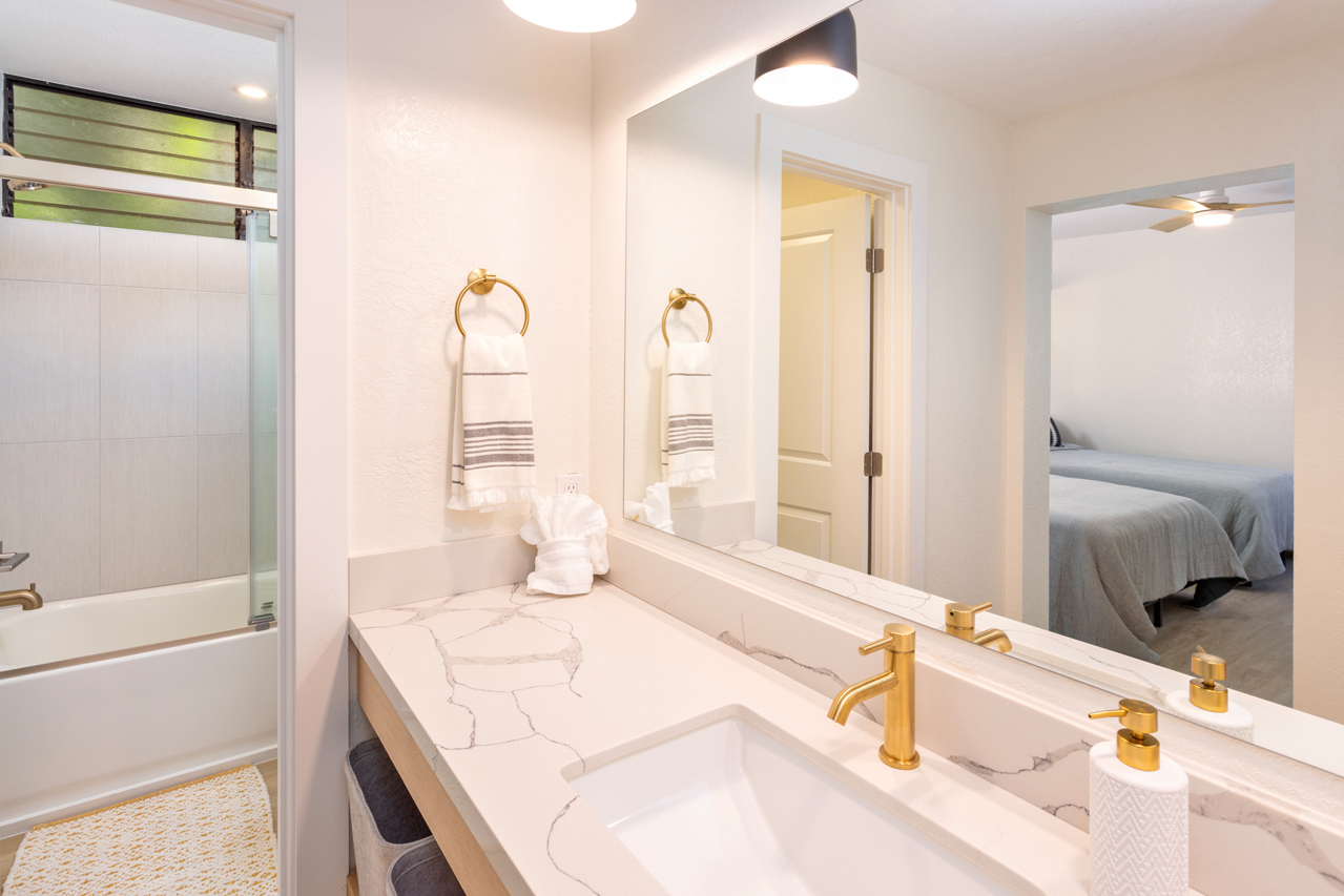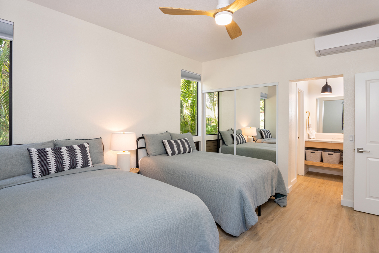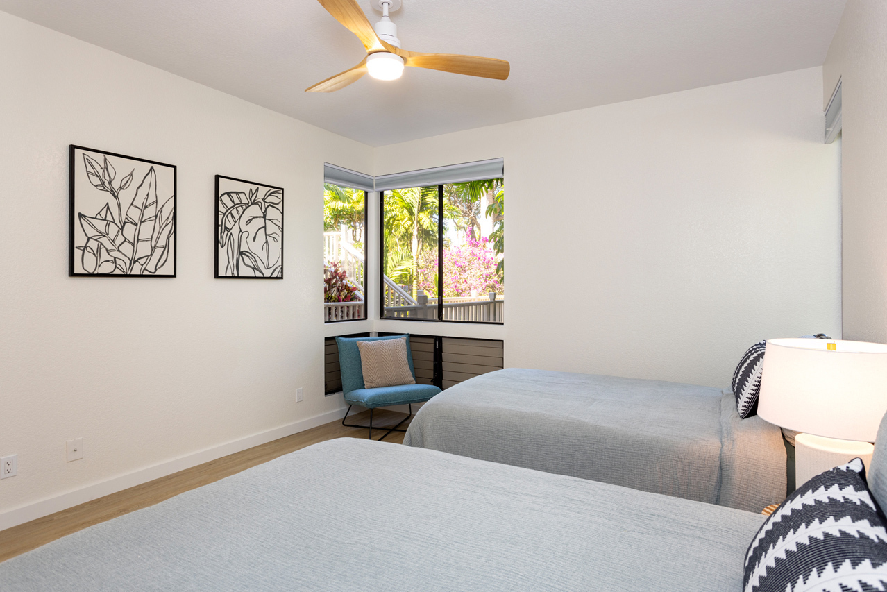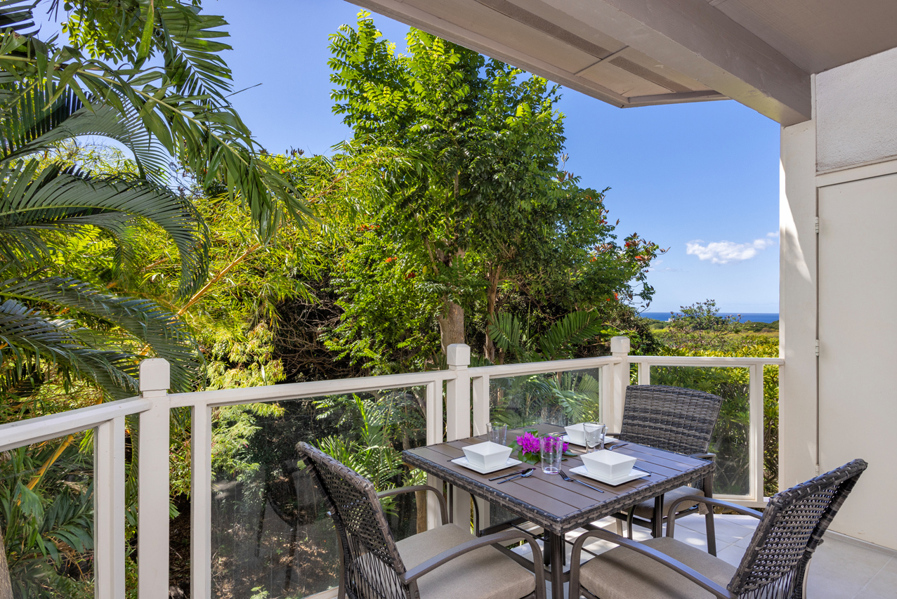 Grand Champions 51 is the vacation home away from home that truly checks all your boxes. Fully renovated and tastefully updated in 2023, this spacious 2 bedroom end-unit has ocean views from the lanai as well as the primary suite while offering privacy and tranquility among the lush tropical landscaping. Immaculate condition and beautifully appointed throughout with new stylish modern decor, luxury vinyl-plank flooring, light fixtures, and ceiling fans. Kitchen has new stainless steel appliances, quartz counters, resurfaced cabinets and custom tile backsplash. Comfort and hospitality is evident with every detail at Grand Champions 51 which has 1,056 square feet of living area along with a 125 sqft lanai for relaxing outdoor dining and sunset views. For added convenience, your assigned parking spot is right in front of the walkway leading to the entrance of your unit.